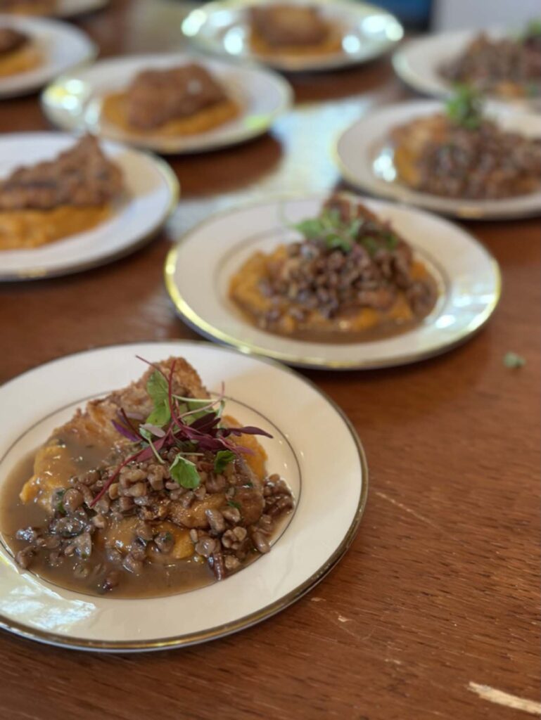Speckled Trout pan fried topped with pecan meuniere sauce served on top mashed cane syrup sweet potatoes