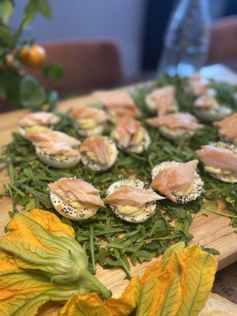 House Smoked Louisiana redfish in ravigote sauce served on sliced cucumber